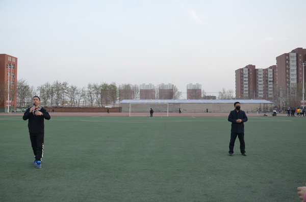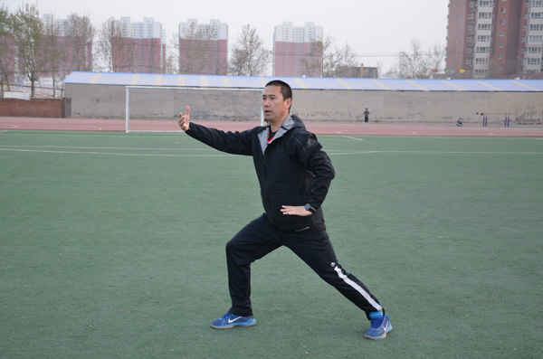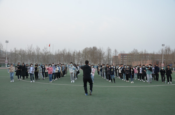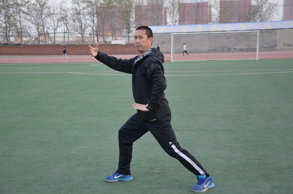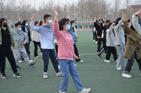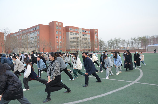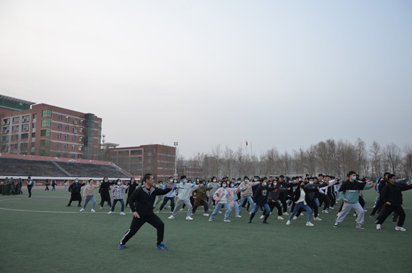 同学们按行列站好队,开始准备活动,学习太极拳二十四式中前三式——起势,左右野马分鬃,白鹤亮翅。