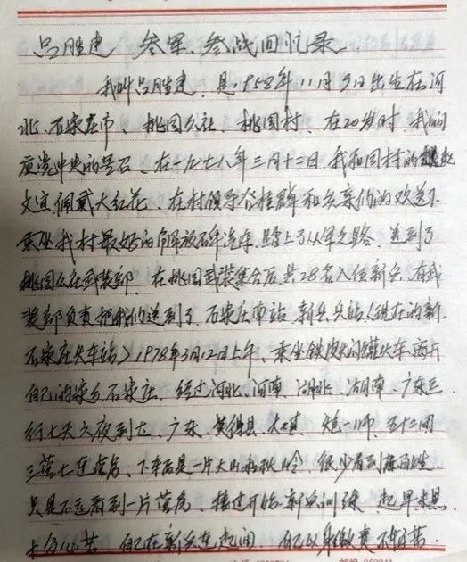 1978年3月12日,吕胜建爷爷与同村的赵文宣爷爷响应党的号召,佩戴大红花,在村领导和乡亲们的欢送之下,坐着铁皮闷罐火车离开家乡,踏上了从军之路。火车的钢轨由宽阔的原野延伸至绵延的群山,从河北到河南,再穿过湖北、湖南,经过七天六夜的漫漫旅途,吕胜建爷爷与同行的27位新兵一同到达了广东省莫得县,加入了解放军炮一师五十二团七连。