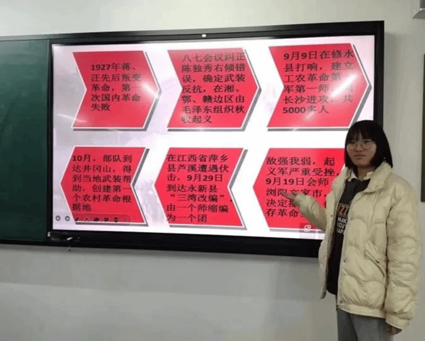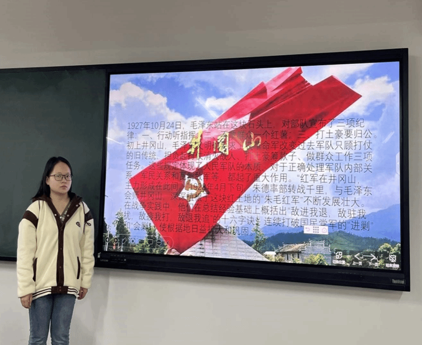 2022级软件工程2班张爽同学给我们讲述了习近平总书记来到江西,看望慰问广大干部群众和驻赣部队,首站就是井冈山。习近平总书记指出:“井冈山时期留给我们最为宝贵的财富,就是跨越时空的井冈山精神。今天,我们要结合新的时代条件,坚持坚定执着追理想、实事求是闯新路、艰苦奋斗攻难关、依靠群众求胜利,让井冈山精神放射出新的时代光芒。”