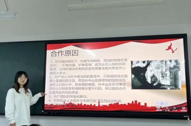 网络空间安全1班的李梦同学和软件工程3班的王雨露同学主要讲述了国共合作的成就。1924年6月孙中山在苏联政府和共产党的帮助之下,在广州建立了黄埔军校。1924年10月孙中山在共产党的协作下镇压了广州商团在英国策划下发生的叛乱。广东革命政府举行讨伐陈炯明的第一次东征;平定驻扎在广州近郊的滇桂军阀杨希闵、陈震寰的叛乱;后参加第二次东征,陈炯明取得全部胜利,这些都有共产党的协助和参加。在共产党的领导下成立了上海总工会,举行了反帝、反侵略、保护工人权益的罢工、游行,遭到英国的镇压,造成了震惊中外的“五卅惨案”。1926年6月开始的以蒋介石为总司令的北伐战争,共产党员也积极参加,其中叶挺的独立团为两湖战场的先锋。由于西安事变的和平解决,推进了第二次国共合作,但第二次国共合作的正式形成,要到八一三淞沪抗战之后。