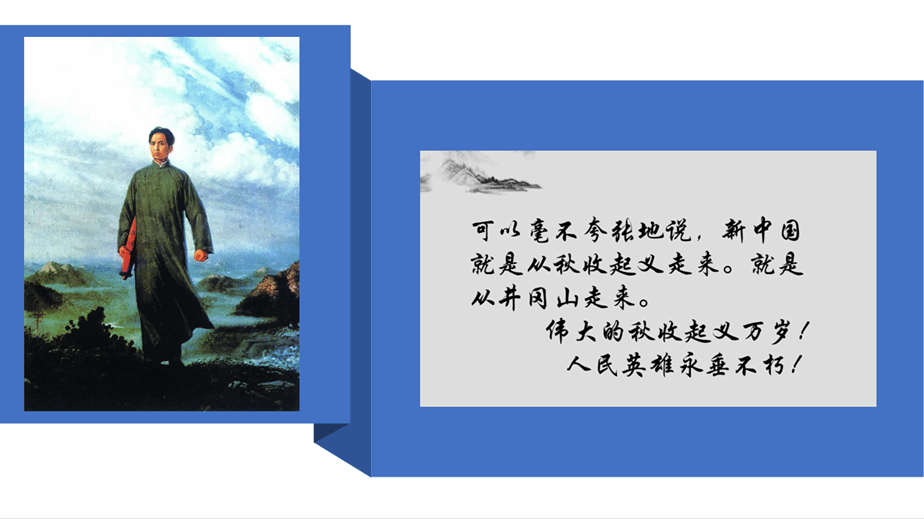 在国共关系日益紧张之下,1927年7月15日,汪精卫控制下的武汉国民政府公开宣布“分共”,彻底划清了共产党和国民党间的界限,国共合作彻底破裂,轰轰烈烈的大革命彻底失败。自此之后,中国共产党革命工作转入地下。面对国民党的压迫和围剿,中国共产党不再妥协,决定夺回革命的主动权。终于,1927年9月9日秋收起义在湘赣边界按照计划爆发。“军叫工农革命,旗号镰刀斧头”。秋收起义的爆发,标志着中国共产党已开始逐渐夺回革命主权,也标志着中国革命迈出了农村包围城市的第一步。那么现在让我们一起来聆听同学们演讲秋收起义的故事。