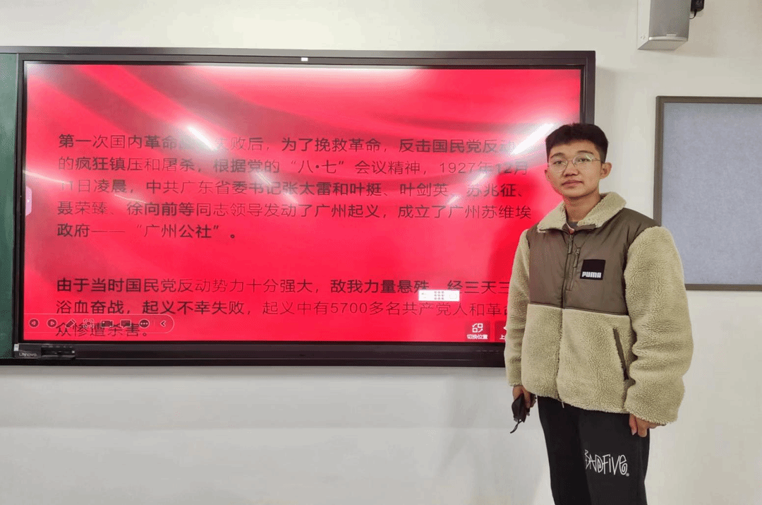 广州起义所蕴含的红色精神是精髓,是激励人们开拓进取、矢志不渝的强大精神支柱,实现中华民族的伟大复兴,需要这些红色精神的支撑。辅导员老师和各班主讲人的的深情讲解,广州起义的一幕幕逐渐呈现在我们眼中。红色故事厚植于广大人民群众的心中,具有强大的生命力,它所承载的红色精神也必将继续激励一代又一代中华儿女为理想和信仰拼搏奋斗,为中华民族伟大复兴的中国梦续写更加壮丽的诗篇。青年一代肩负民族复兴大任,应当珍惜韶华,学好过硬本领。用过硬本领回应时代挑战和责任担当,让青春在中华民族复兴的伟大梦想里绽放。