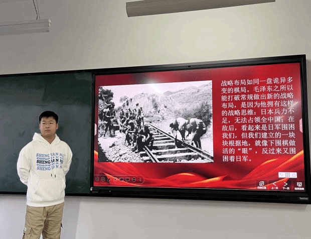 网络空间安全三班的杨梦涛同学和软件工程一班的张文飞同学主要介绍了敌后抗战的地位和作用。中国共产党领导的敌后游击战有效的牵制消耗了日军的有生力量,至1944年初,中国共产党领导的人民军队抗击了64.5%的侵华日军和几乎全部的伪军。百万日军深陷中国战场泥潭,无法在关内抽出兵力“北进”和“南下”,这大大加速了太平战场美国对日作战胜利的进程,解决了苏联两线作战的危险,对世界反法西斯战争特别是亚洲战场的胜利作出了极大贡献。