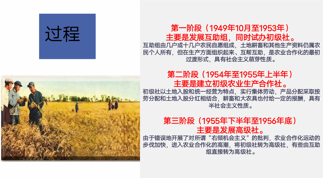 2022级软件工程4班的李强同学为同学们阐述了农业社会主义改造这一社会变革过程,大体可以分为三个阶段:第一阶段是从1949年10月到1953年,主要是发展互助组,同时试办初级农业生产合作社;第二阶段是从1954年到1955年上半年,主要是建立初级农业生产合作社。第三阶段是从1955年下半年至1956年底,主要是发展高级农业生产合作社。