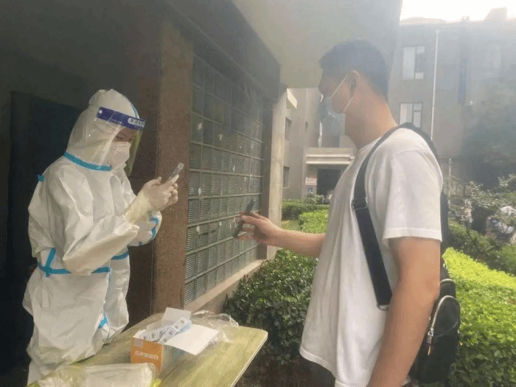 在疫情防控形势严峻的情况下,刚返乡的王啸天同学主动请缨担任起信息登记员,统计社区采集核酸信息,有序维持核酸检测秩序。每次到采集核酸的时间,他都会耐心提醒社区居民做核酸,并协助社区医护工作者为居民采集核酸。这是他第一次穿上防护服,成为一名“新手信息登记大白”,尽管穿着密不透风的防护服,汗流浃背,他依旧保持着耐心,为每一位前来的群众提供帮助。面对腿脚不好的老人,他主动上门帮助其采集核酸。