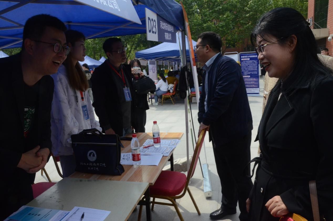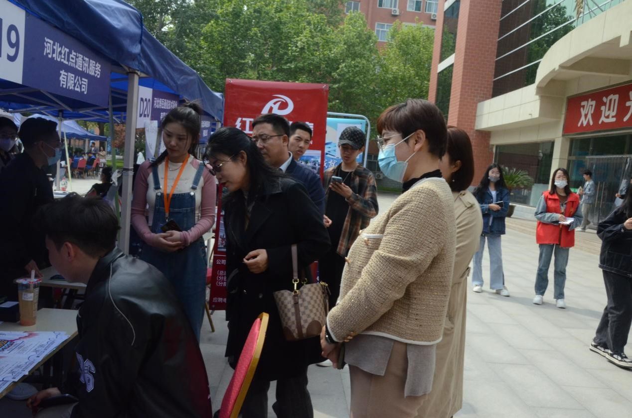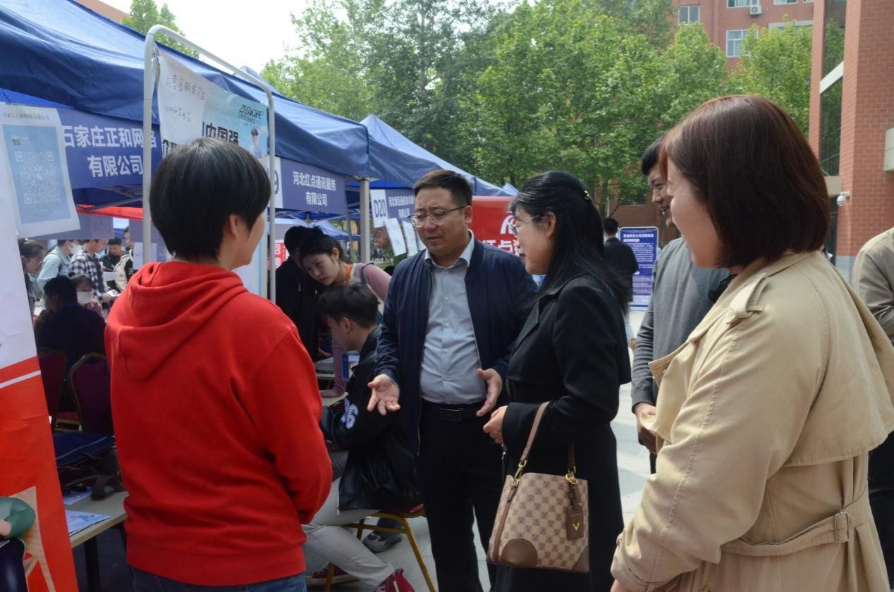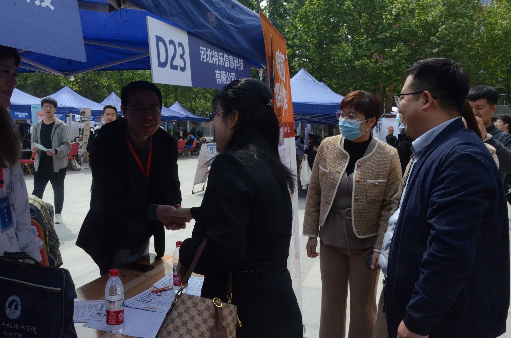 4月27日上午,太阳成集团tyc122ccvip协助市人社局、市教育局联合举办了“就业在‘冀’·职引未来”2023年石家庄市公共就业服务进校园软件和信息技术服务行业招聘会。在招聘会现场,太阳成集团tyc122ccvip赵冬梅经理、党总支书记王亚杰、教学副经理张波,特意与河北特乐信息科技有限公司、河北乐坤信息技术有限公司、河北博岳通信技术股份有限公司、河北红点通讯服务有限公司、平安普惠信息服务有限公司石家庄第一分公司、石家庄文腾商贸有限公司、石家庄朗宁体育用品科技有限公司等7家企业进行现场岗位对接交流。