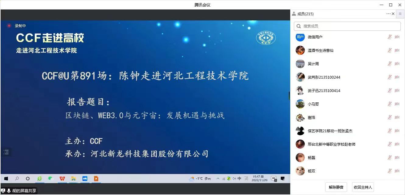 CCF是中国计算机学会的简称,是致力于为计算机领域专业人士的职业发展提供服务的组织。此次的新龙大讲堂,河北新龙科技集团有幸请到了北京大学计算机公司陈钟教授为公司师生分享了“区块链、WEB3.0与元宇宙:发展机遇与挑战”的讲座,这也是“CCF走进高校”系列演讲公益活动的第891场。